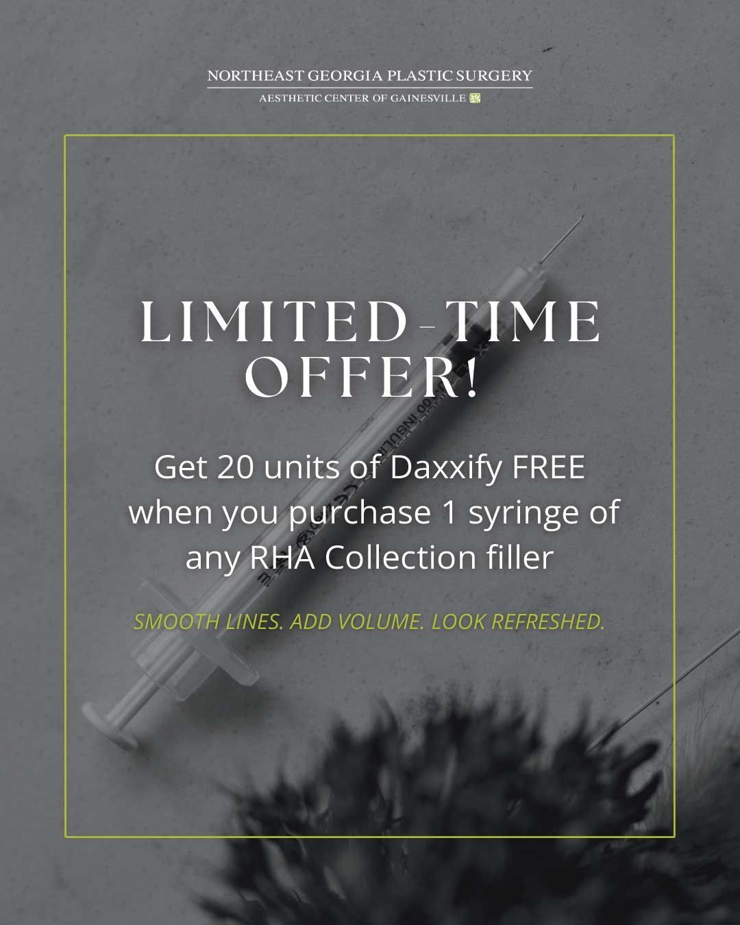 Get 20 uits of Daxxify FREE when you purchase 1 syringe of any RHA Collection filler